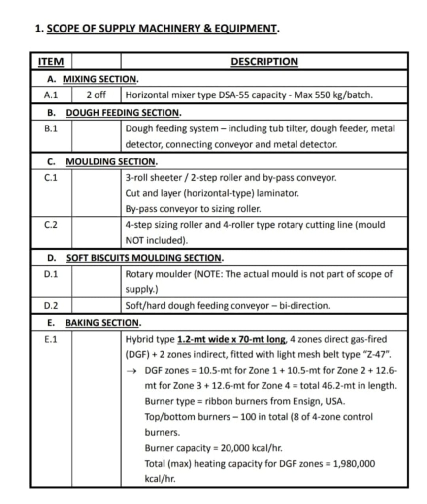 Dong Yang Korea buiscuit line for soft and hard cookies. Complete line from mixing to packing. Oven is 1.2 m wide and 70 m long. attached below are details of equipment and pictures