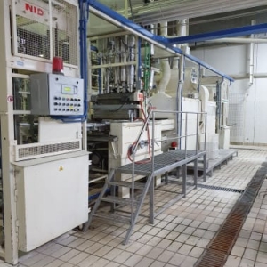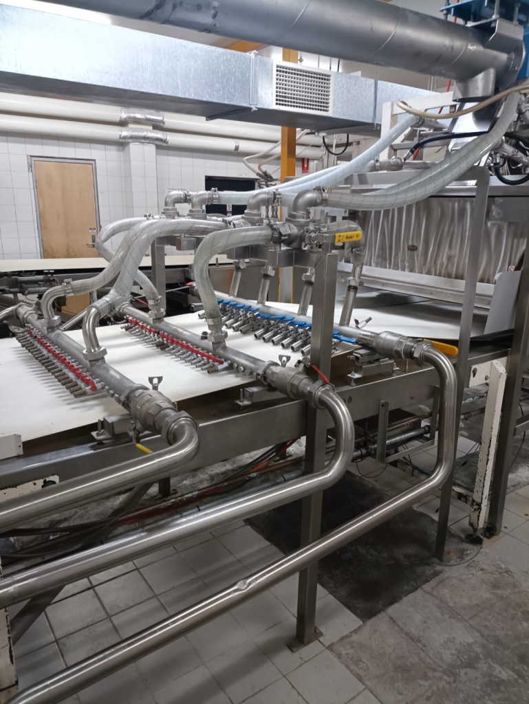 A marshmallow kitchen with APV scrapped surface heat exchanger and Waukesha Cherry Burrel aerator connected to two marshmallow lines. One deposited marshmallow for two colour simultaneous depositing of single colour product. Another extruded marshmallow line capable of simultaneous extrusion of three different colour marshmallow (single colour extrusion). Different diameter nozzles for different thickness of product and gluten cutter at the end for precision cutting length. Items included: